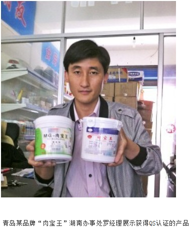 記者隨意走進(jìn)10棟的一家食用化工商行。該商行的進(jìn)門處,放著多箱標(biāo)注產(chǎn)地為青島的“肉寶王”。記者從貨架上拿起一桶正要查看,老板蔡先生循聲從里面走出來(lái),警惕地問:“你是做什么的?”記者表明了身份,表示希望坦誠(chéng)交流,蔡先生這才放松緊張情緒!澳悴粫缘,這兩天來(lái)我店子里暗訪的記者不止一位,所以我一看你走進(jìn)來(lái),就猜你可能也是記者!辈滔壬f(shuō)。