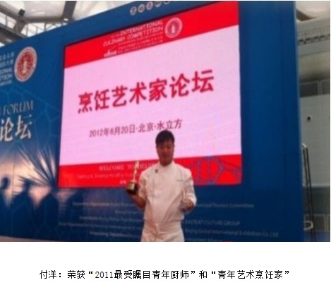 在首屆北京奧林匹克公園國際美食大賽暨第留屆東方美食烹飪藝術(shù)家國際大賽,第一場(chǎng)個(gè)人賽中,付洋勇奪第一名。2012年6月20日烹飪藝術(shù)家論壇,北京-水立方站頒獎(jiǎng)典禮上,付洋榮獲“2011年最受矚目青年廚師”和“青年藝術(shù)烹飪家”。