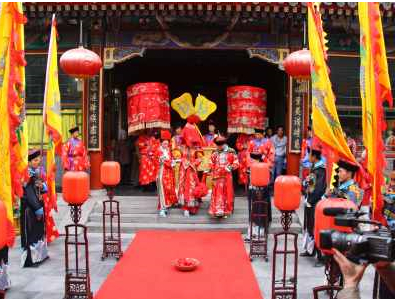 仿膳飯莊的婚宴很有中國(guó)傳統(tǒng)氛圍。新娘可以坐著八抬大轎,在眾多吹鼓手吹吹打打的簇?fù)硐拢瑥谋焙9珗@東門進(jìn)入公園,過石橋、穿游廊再回到仿膳飯莊的大門口。新郎則將蒙著蓋頭的新娘扶下轎,在繽紛的禮花中牽著新娘邁火盆、過馬鞍,走進(jìn)雕梁畫棟、金碧輝煌的漪瀾堂大廳,舉行隆重的婚禮。飯莊還為新人準(zhǔn)備了大紅喜帳、紅地毯、香檳酒塔臺(tái)、音響等設(shè)備。如果新人有興趣,還可以租一艘龍舟,在北海水上環(huán)湖一周,寓意即將到來的新生活順風(fēng)順?biāo)?span lang="EN-US">