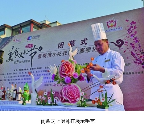 昨日,歷時一個月的“2012第五屆中國南京美食文化節(jié)”在南京市夫子廟秦淮風光帶圓滿落幕。閉幕式上,名店大廚現場PK廚藝,創(chuàng)新的秦淮小吃吸引了廣大市民前往品嘗。此次美食節(jié)由南京市政府、南京市商務局主辦,南京市餐飲商會協辦,揚子晚報參與承辦。美食節(jié)以“民國大菜”和“秦淮小吃”為主題,組織了一系列活色生香的美食活動,市民參與度極廣,整個美食節(jié)既體現南京美食文化水平,也極具互動性,在社會上產生了廣泛的影響力。