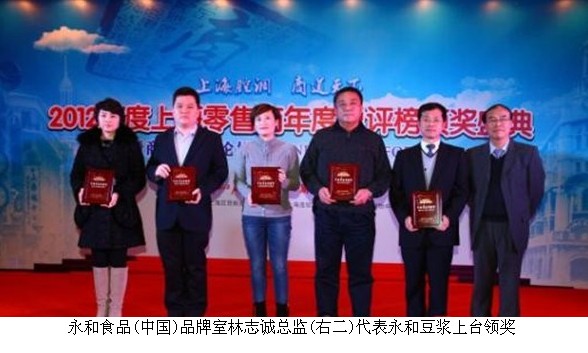 2013年1月8日,由解放日報報業集團下屬新聞晚報主辦,上海百貨商業行業協會、上海連鎖經營協會、上海購物中心協會協辦的商業精英論壇暨2012年上海零售商總評榜在外灘威斯汀酒店舉行。永和食品(中國)有限公司(商品名:永和豆漿)榮獲2012年度上海零售商“年度公益貢獻獎”榮譽。品牌公共事務室林志誠總監代表企業赴會領獎。