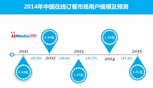 iiMedia Research數(shù)據(jù)顯示,2013年中國在線訂餐市場用戶規(guī)模達(dá)到1.07億,預(yù)計(jì)2014年中國在線訂餐用戶規(guī)模將達(dá)到1.58億。