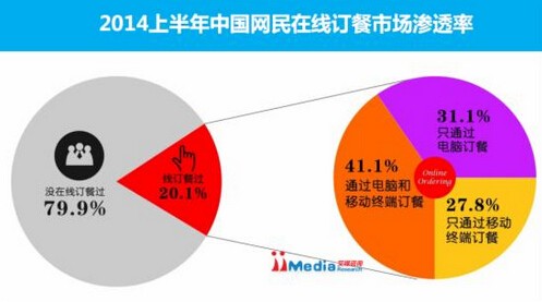 iiMedia Research數(shù)據(jù)顯示,2014年上半年中國網(wǎng)民在線訂餐滲透率達(dá)到20.1%。在訂餐網(wǎng)民中,有27.8%只通過手機(jī)、平板等移動(dòng)終端進(jìn)行訂餐,只通過電腦訂餐的占31.1%。