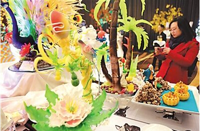 除了特色菜品外,本屆APEC會議餐飲的擺臺也將成為一次“文化盛宴”,老北京四合院及影壁墻、百鳥朝鳳、孔雀迎賓、八仙過海等中國元素,將作 為裝飾出現在會議餐桌上。據相關負責人介紹,屆時將有8組不同風格的裝飾將點亮餐桌,通過糖雕、果蔬雕、面塑等各種食品雕塑來體現中國文化。其中很多擺臺 更是直接以北京民俗為主題,比如老北京四合院及影壁、天壇、糖葫蘆群像、石獅子……