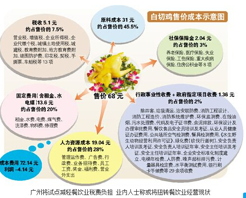 “點只白切雞,一條腿交稅!”據飲食商會的數據顯示,廣州餐飲業要繳納的稅費高達50項,占營業收入的12.5%。記者從廣州市經貿委獲悉,為推動餐飲業的大眾化轉型升級,商務部即將在廣州試點減輕餐飲業稅費負擔。