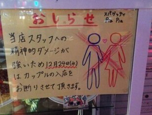 據(jù)香港《文匯報》12日報道,圣誕節(jié)本應(yīng)普天同慶,但對單身人士而言,到處都是成雙成對只能覺得郁悶。日本東京八王子市意式餐廳Pia Pia考慮到在平安夜上班員工的感受,特別在門口貼告示,宣布平安夜當(dāng)日謝絕情侶光顧。