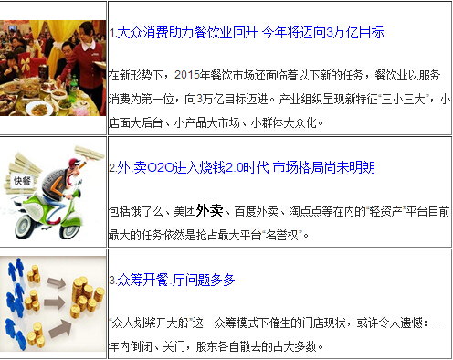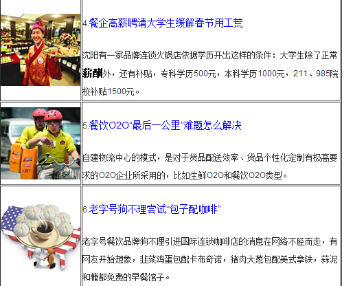 老字號(hào)狗不理包子引進(jìn)咖啡連鎖店,包子配咖啡的混搭引起網(wǎng)友熱評(píng);臨近春節(jié),餐飲服務(wù)員緊缺,有餐企特別歡迎大學(xué)生寒假兼職餐館服務(wù)員,并給予特殊補(bǔ)貼;據(jù)統(tǒng)計(jì),2014年餐飲業(yè)收入數(shù)據(jù)終于回升,2015年將向3萬億目標(biāo)邁進(jìn)。