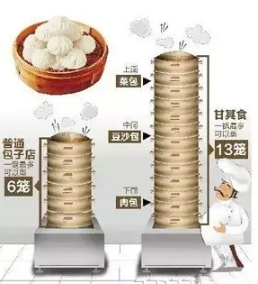 在甘其食,每個人都會看到壘得很高的蒸籠,如果細心一點你會發現,其他包子店,頂多只能壘6層,不是不想多蒸幾籠提高效率,而是再高就熟不了了。甘其食最高能夠達到13層,“從9層到10層再到13層,這個是經過了多少次試驗、重新定制蒸鍋等設備才能達到的。”童啟華說,不光如此,下面幾層以下只能蒸肉包,中間幾層蒸豆沙包等都是有白紙黑字規定的,最上面只能蒸青菜香菇包。“蒸包子是有講究的,肉是生的,青菜香菇是半熟的,一定要同時熟才行。”