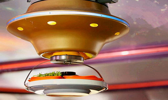 進入餐廳,首先映入眼簾的是頭頂上灰藍的太空和耀眼的星星天幕,最奇特的是有幾只金色的飛碟吊著托盤,托盤上盛滿菜,沿著軌道在“太空”中運轉。當運轉至餐桌上方,飛碟會自己停住,伸下長長的“腰”,將菜送至客人面前。