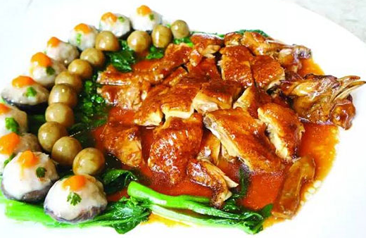 一只成品的“廣州茅臺雞”以切好的茅臺雞為身,菜心軟、草菇、百花釀花菇為尾,最后淋上用茅臺雞身內的蔥姜料頭、茅臺酒推制的芡汁。