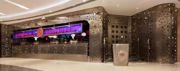 遠處看像盤踞在商場里的金屬洞穴,外圍用不銹鋼緊緊包裹,墻壁上安置了碩大的金銀兩色蜘蛛。在進門處,運用高科技手段,用水幕再現(xiàn)了一個逼真的水簾洞。餐桌上每個蜘蛛都帶上了緊箍咒,這些蜘蛛也成為嘻游記餐廳的標志元素。設(shè)計時沒有刻意去塑造西游記的形象,而是用很多插畫來表達現(xiàn)代想象。翻開菜單就像是翻開一本故事書,菜名都非常有西游記特色,例如“俺老孫最牛”、“女兒國的春夢”、“松茸洋芋紫金缽”等。