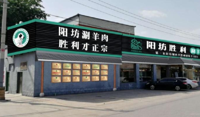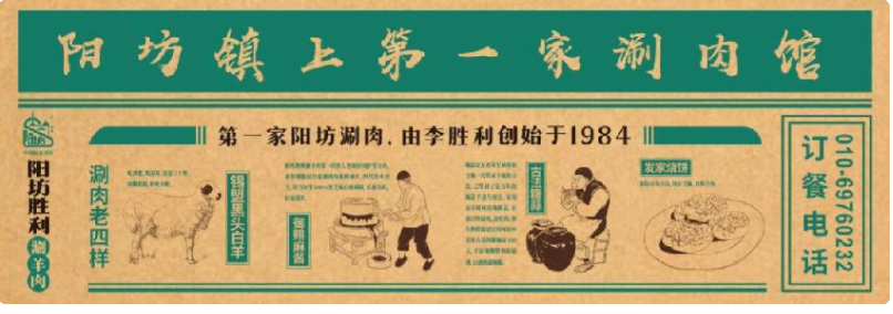 首先確定了陽坊鎮(zhèn)老店的門頭上的品牌故事:第一家陽坊涮羊肉由李勝利創(chuàng)始于1984,強調“陽坊涮羊肉,勝利才正宗”。